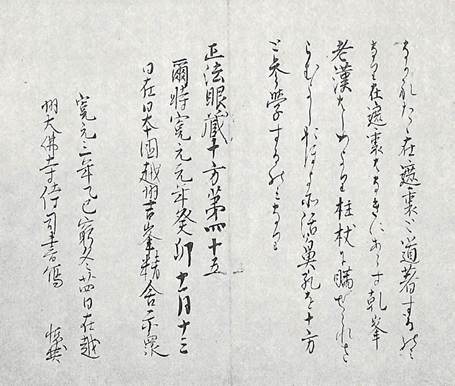 道元は「久しく人間を舎てて愛惜なし、文章筆硯すでになげうち来る、花を看、鳥を聞くも風情少し、時人の不才を笑うに一任す」といいながら、まことにすぐれた詩歌文章を残した。筆跡もまた調べ高く、その詩趣、高韻の掬すべきものがある。