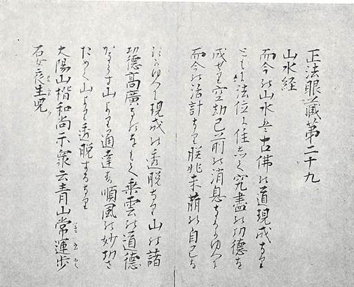 図二四は、「正法眼蔵」山水経の冒頭の部分である。粛然とした態度で書かれていて、ひびき高く澄み切った書である。道元の鋭い感性と切実な道心が思われる。この山水経は、奥書があり、「尓時仁治元年庚子十月十八日子時在観音導利興聖宝林寺示衆」と認められているということで、道元五十歳に当る。