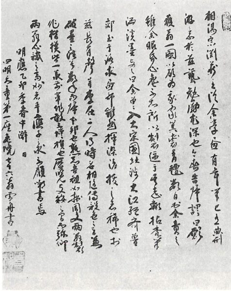 雪舟の絵を見ると、実に善く毛筆を使っていることが知られる。毛筆の表現性を見事に生かした用筆である。それ故に文字を書いてもそれが立派な表現となることは自然の道理であろう。春名好重は、「雪舟の書は巧妙にして優秀である。いわゆる書家ではないが、書を巧妙に書くことができたので、書家といわれてもよい」と述べている。氏はまた「図画考略記」にある「雪舟二字説」を紹介しているが、雪舟は「好んで昔賢の墨妙を集め、楚石老人の書する所の二大字を得て、以てこれを宝とし、遂に自ら雪舟と号し」たという。「楚石老人」とは元の禅僧楚石梵琦(一二九六―一三七〇)である。審美眼の高い禅者雪舟がすぐれた墨跡に着目し、いたく尊重したであろうことは想像に難くない。